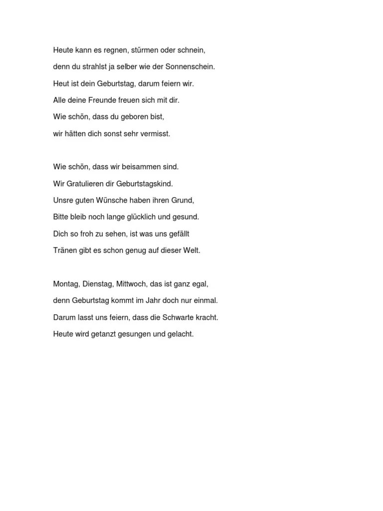 Heute kann es regnen stürmen oder schneien denn du strahlst ja selber wie der sonnenschein heut ist dein geburtstag darum feiern wir alle deine freunde freuen sich mit dir alle deine freunde freuen sich mit dir wie schön dass du geboren bist wir hätten dich sonst sehr vermisst wie schön dass wir beisammen sind wir gratulieren dir geburtstagskind. Heute ist geburtstag darum singen wir english.